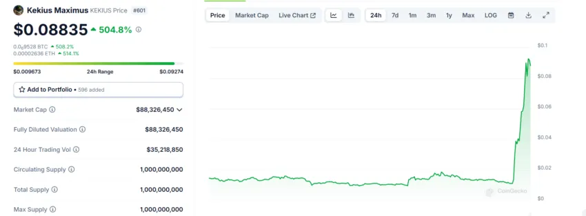 Theo dữ liệu từ CoinGecko, khối lượng giao dịch 24 giờ của Kekius Maximus đã đạt 35,2 triệu USD, trong khi vốn hóa thị trường đã vượt 88,32 triệu USD sau khi giá tăng vọt.